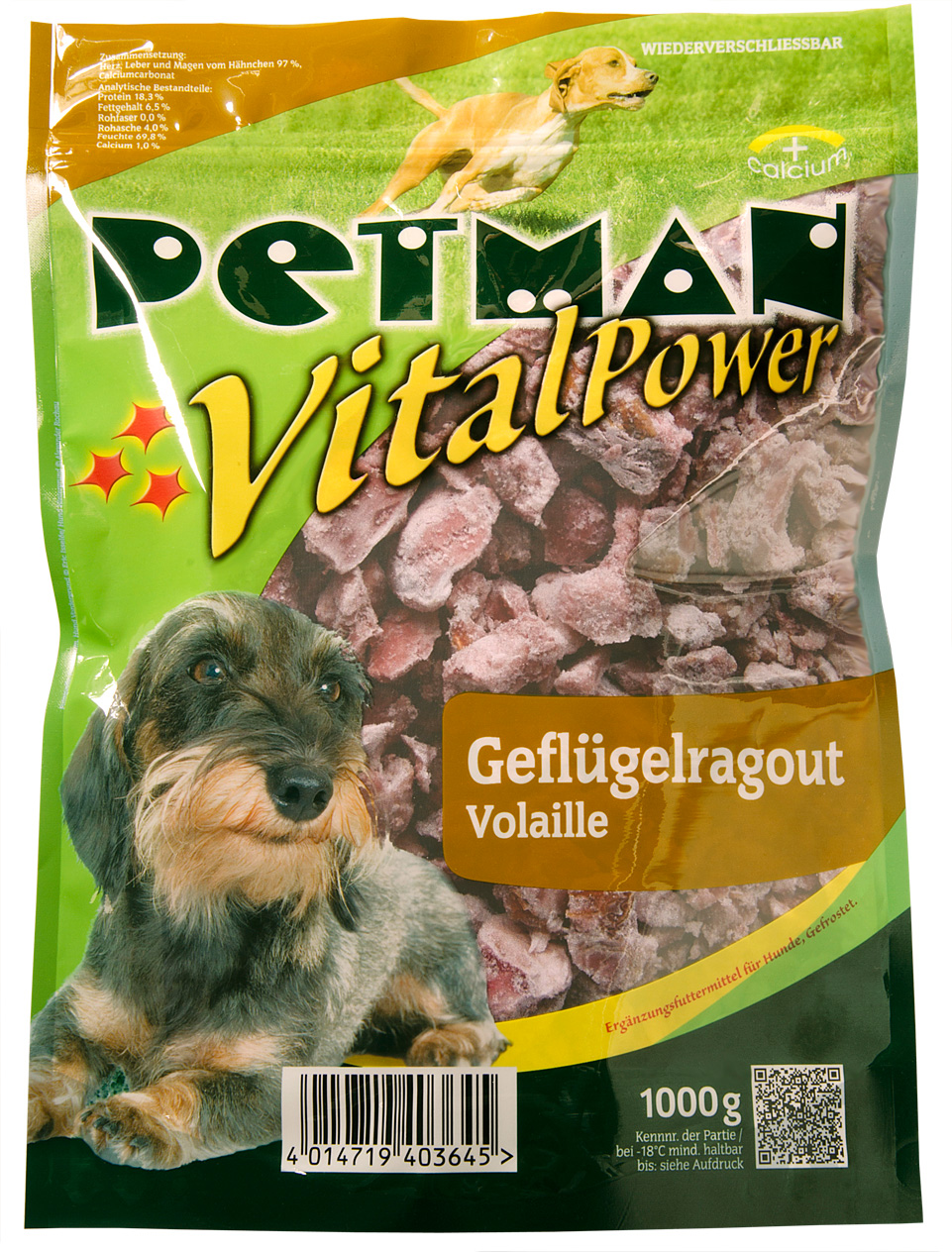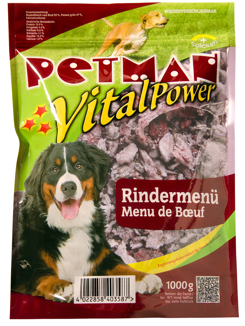 Zusammensetzung: Muskelfleisch vom Rind 50 %, Pansen grün 47 %, Calciumcarbonat
