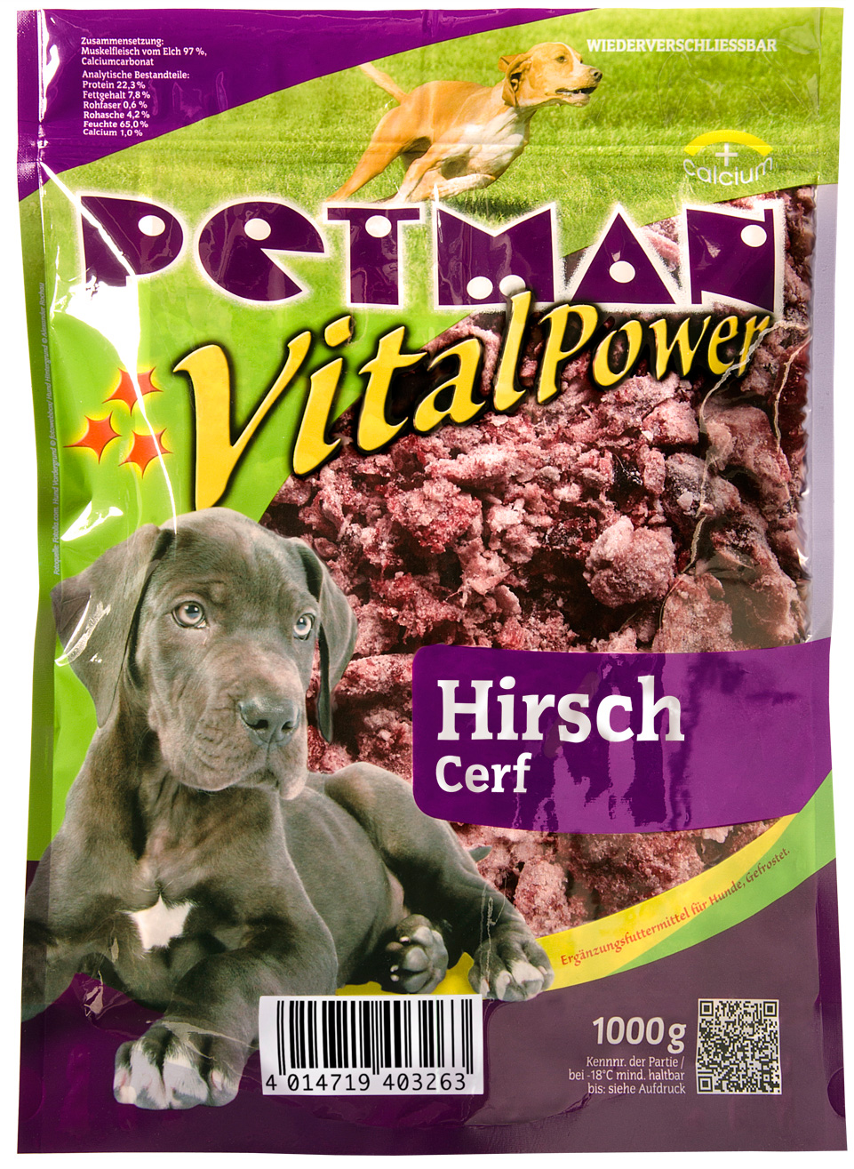 Zusammensetzung: Muskelfleisch vom Hirsch/ Rotwild 97%, Calciumcarbonat
