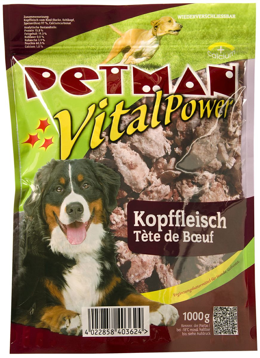 Kopffleisch 62253 Kernig und herzhaft mit naturgemäß hohem Rindertalg-Gehalt. Besonders geeignet für Hunde mit hoher Lauf- oder Arbeitsleistung. Energiespender in Rationen für hochträchtige oder säugende Hündinnen. Pur geeignet als vereinzelte Power-Happen und zur zeitweiligen Belohnung.