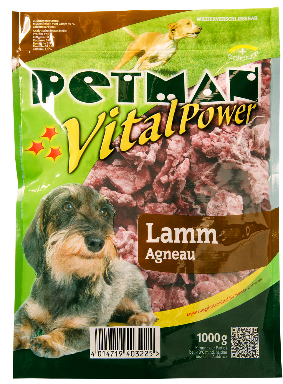 Lamm 14975 Zartes würziges Lammfleisch bietet aromatische Abwechslung im Futternapf. PETMAN Lamm ist besonders für Arbeits- und Leistungstiere geeignet. Frisch aufgetaut als Snack oder als energiereiche tierische Eiweißzutat im Petman B.A.R.F.-System, lässt es sich wunderbar mit kohlenhydrathaltigen, fettarmen Produkten ergänzen.