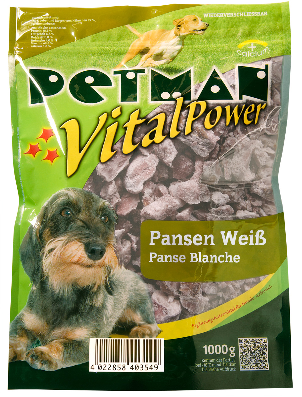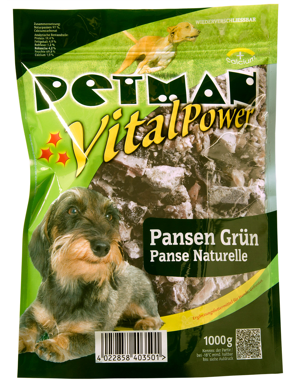 Pansen Plus 13281 PETMAN Pansen Plus ist ein energie- und proteinreiches Ergänzungsfuttermittel für ausgewachsene Hunde. Getreidefrei. Gefrostet.