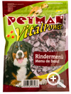 Rindermenü 80938 Schmackhafte Stücke vom Rind wurden nach Art eines kräftigen Gulaschs schonend verarbeitet. Die bissfesten Happen bereichern jedes selbstzubereitete Hundemenü und zeichnen sich durch ein exzellentes Energie- und Proteinverhältnis aus. Zum Mischen mit Kartoffeln oder Getreide, aber auch pur ist Rindfleisch für jeden Hund ein Genuss.