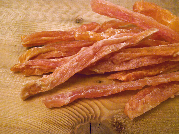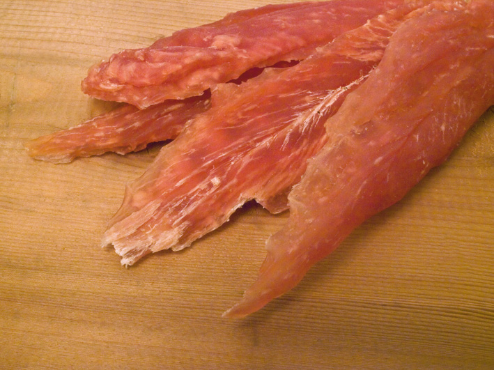Hühnerbrustfilet getrocknet 136134 Dieses hochwertige Naturprodukt aus reinem Hühnerbrustfilet ist ein Leckerbissen mit wenig Fett. Überzeugend gehaltvoll und kerngesund. Rohprotein 52,8%